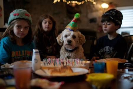 Dog wearing birthday hat sitting at table with cake and candles celebrating birthday with family