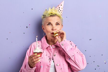 stylish woman in party hat blowing noisemaker, celebrating birthday, holiday party. isolated blue background, studio shot