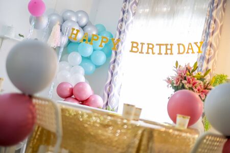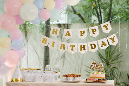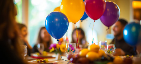 A festive table set for a celebration with balloons and streamers, with ample open space for text.