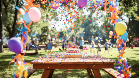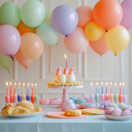 A birthday table features colorful desserts, vibrant balloons, and glowing candles, creating a joyful celebration atmosphere.