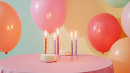 A lively birthday table decorated with bright balloons, featuring glowing candles on a cake surrounded by cheerful colors at a celebration.