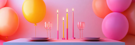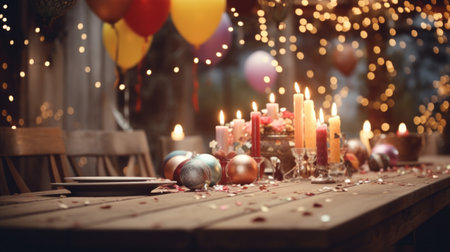 A lively birthday table adorned with striking balloons and flickering candles sets the mood for a joyful celebration during the night.