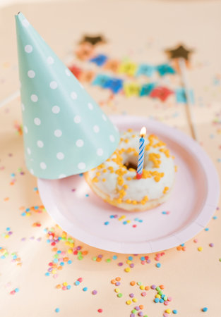 Tasty donut with burning candle on a pink plate and blue birthday hat on a beige background with confetti. Happy birthday party table setting concept with copy space