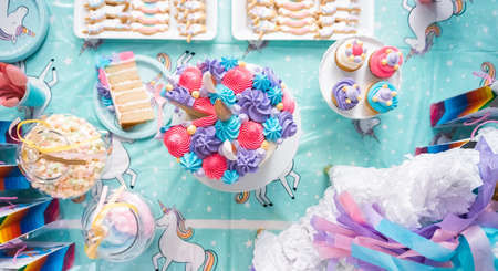 Little girl birthday party table with unicorn cake, cupcakes, and sugaer cookies.