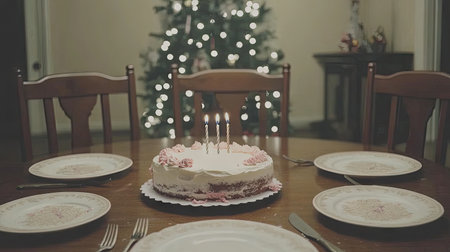 An empty birthday cake sits on the table, surrounded by three plates. Two candles burn atop the half-eaten cake. In the background, an unlit Christmas tree stands in front of wooden chairs, creating a calm atmosphere. No one is present in the dining area. A fork lies beside each plate, suggesting that food has been served. The soft lighting outside indicates it is nighttime, adding to the cinematic feel of the scene. --chaos 30 --ar 16:9 --v 6.1 Job ID: d6ff36a4-9a37-42d6-aa3b-6da8ccfa0502