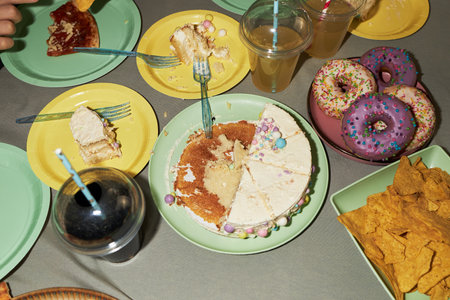 Overhead view showing partially eaten cake with colorful candies, donuts with sprinkles, tortilla chips, and drinks on table, visible hand of child reaching for dessert
