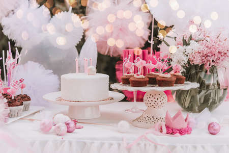Birthday tablescape or candy bar with sweets, Birthday cake and cupcakes, beautiful party and celebration