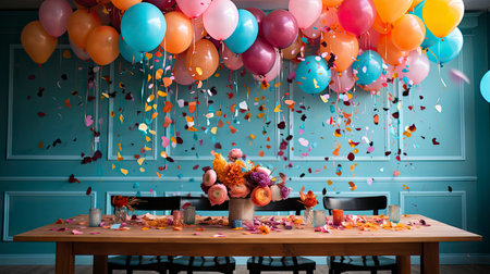 A festively decorated dining room set up for a party with a long table covered in confetti. Colorful balloons, streamers, and a disco ball hang from the ceiling, creating a joyful and celebratory atmosphere.