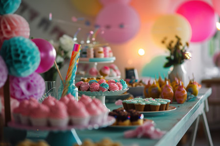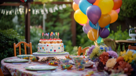 Delight in a vivid birthday celebration scene featuring an inviting table adorned with colorful cupcakes, a stunning cake, bright balloons, and cheerful floral arrangements.