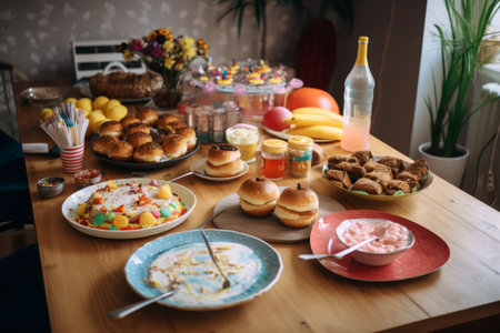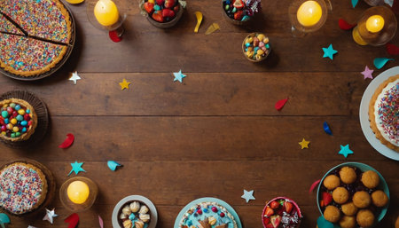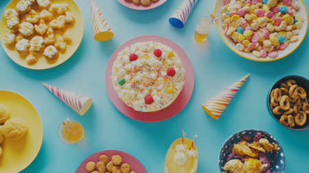 A vibrant and joyful arrangement of desserts featuring a colorful cake, assorted candies, and delicious snacks set against a bright background, perfect for celebrations.