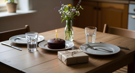A simple and intimate birthday celebration setup on a wooden table, featuring a small chocolate cake with a single lit candle. The scene includes a brown paper-wrapped gift, white plates, glasses of water, and a vase of fresh wildflowers in the background.