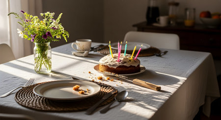 A rustic birthday cake with lit colorful candles sits on a linen-covered table, accompanied by a jar of fresh wildflowers. Empty plates and cutlery are arranged for a celebration, bathed in warm afternoon sunlight that casts long shadows. The scene evokes a cozy, intimate gathering at home.