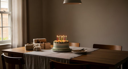 A festive dining table is set with a lit birthday cake and several brown paper-wrapped gifts. The warm, inviting scene captures the atmosphere of a quiet, intimate celebration ready to begin.