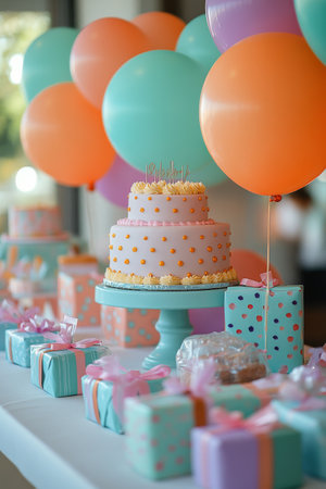 A vibrant party table showcases a multi layer cake with pastel frosting. Colorful balloons and gifts enhance the joyful atmosphere, perfect for a birthday gathering.