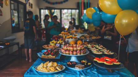 A vibrant gathering features a beautifully arranged table, adorned with balloons, cakes, and desserts, radiating joy and festivity.