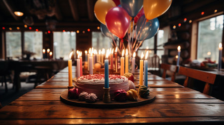 A cozy birthday gathering unfolds as a beautifully arranged table showcases a delicious cake adorned with lit candles. Colorful balloons sway gently overhead, adding charm to the festive atmosphere. Plates are artistically set, filled with treats waiting to be enjoyed.