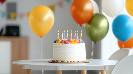 Immerse in the joy of a birthday celebration with this vivid image featuring colorful party balloons, a festive backdrop, and a delightful birthday cake crowned with glowing candles, perfect for