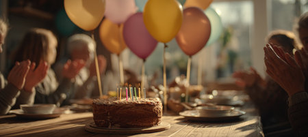 A family gathers around a wooden table with a homemade cake and colorful balloons, clapping and smiling in the golden afternoon sunlight, capturing a moment of documentary realism.