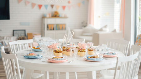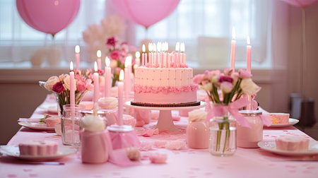 Child birthday party table in pink hues. Empty decorated room for event. Generative AI