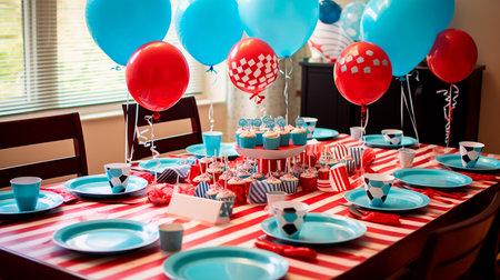 birthday table setting with plates, napkins, and party favors, created with generative ai