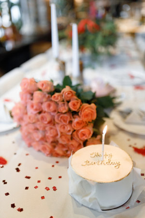 A beautifully set table adorned with a bouquet of pink roses, lit candles, and a birthday cake with Happy Birthday written on it, capturing the essence of a festive occasion