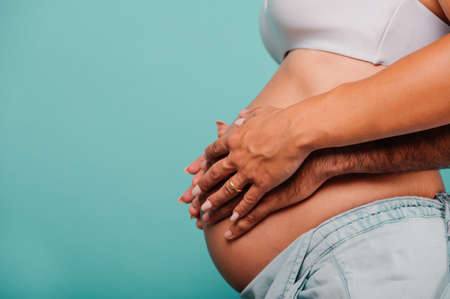 Pregnant woman expecting a child caresses her belly