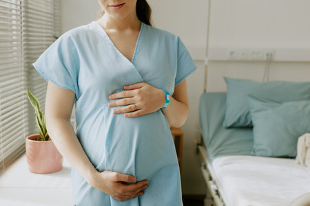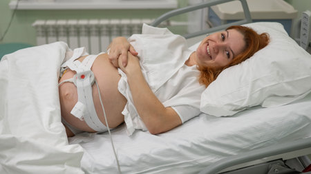 Pregnant woman lying in bed waiting for childbirth with medical supervision in a hospital.