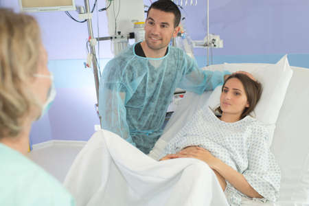 Caucasian people with pregnancy looking at camera and sitting in hospital ward. Smiling couple expecting child and baby delivery while pregnant woman laying in bed at medical clinic