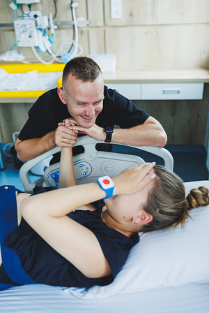 A man holds the hand of his wife who is giving birth to a child. The beginning of labor in a young woman. Husband's support during childbirth. Partner childbirth. Delivery room.