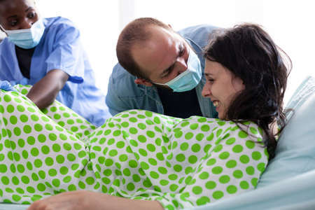 Caucasian person giving birth to child at maternity sitting in hospital ward bed. Multi ethnic maternity doctor and nurse helping young family with delivery. Pregnant woman getting assistance
