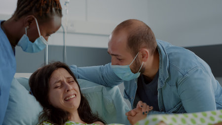 Young woman in pain pushing for childbirth at maternity while african american nurse assisting in hospital ward. Person giving birth while laying in bed and father of baby holding hand