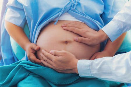 Pregnant woman belly inspecting by doctor hand