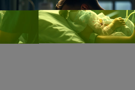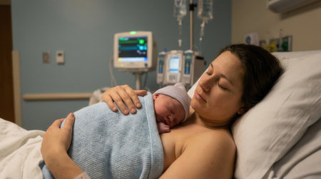 A woman rests in a hospital bed, embracing her swaddled newborn baby. This tender scene captures the immediate bond and love between mother and child post-birth.