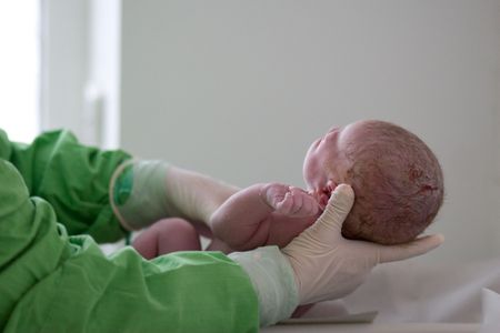 Newborn child seconds and minutes after birth. Doctor hands with new born baby. Medical check up of health and reflexes of child. New life, beginning, healthcare
