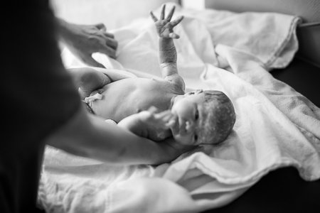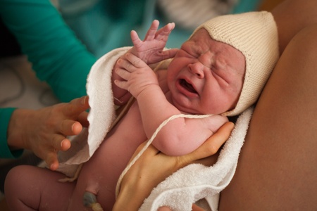 Newborn baby on his mothers arms right after delivery