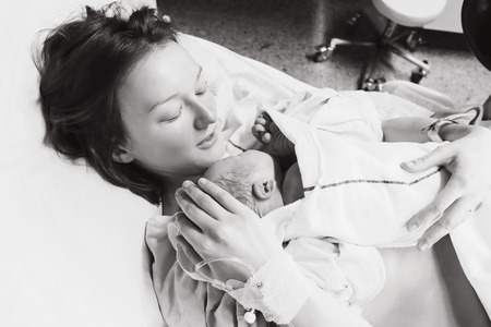 Mother holding her newborn baby child after labor in a hospital. Black and white photo. Parent and infant first moments of bonding.