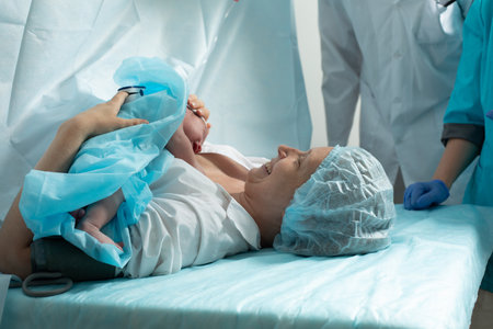 Baby on mothers chest immediately after birth in a hospital. The mother and newborn share a tender moment, emphasizing the bond and emotional connection. The medical staff ensures a safe and caring environment