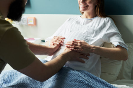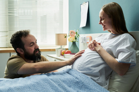 Caucasian pregnant young adult woman lying in hospital bed smiling while young adult man gently touching her belly showing support and affection during prenatal care