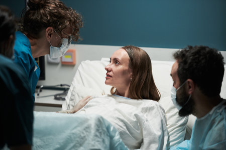 Caucasian young adult woman lying in hospital bed experiencing labor assisted by female nurse in scrubs while man supporting her during childbirth process