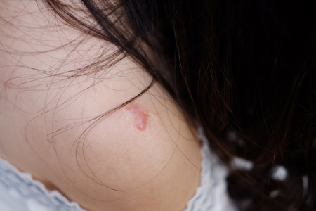 Close up BCG vaccination scars awaken an abscess on shoulder of Asian woman. Bacillus Calmette Gurin vaccine