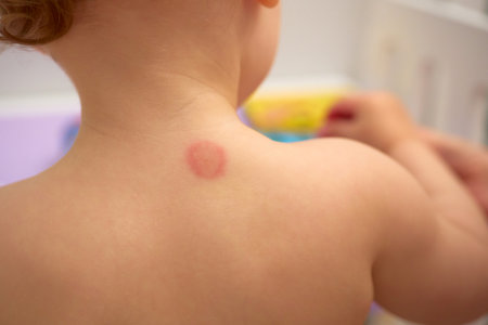 A young child has a noticeable mosquito bite on the back, sitting in a playful area filled with colorful toys