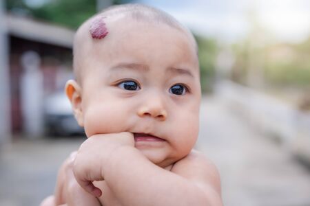 Portrait photo of an adorable little baby girl is sucking and biting her thumb fingers thoughtfully with green background at sunrise. Baby development of 5-6 months aged and oral healthcare concept.