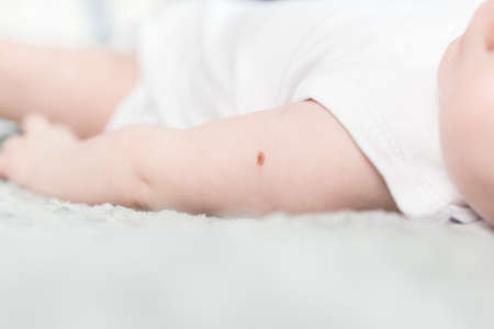 Hand of a newborn with traces of BCG vaccination - a vaccine against tuberculosis prepared from a strain of weakened live bovine tuberculosis Bacillus, which has almost lost virulence for humans