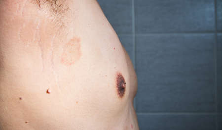 Man with birthmarks on his skin against grey background, closeup