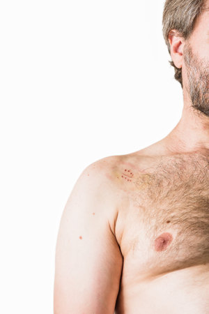 Close up detail of the bare skin on a man back with scattered moles and freckles. Checking benign moles. Sun effect on skin. Birthmarks on skin