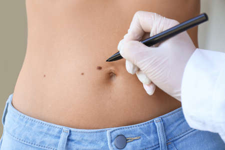 Moles on the skin with a painted smile. The concept of a healthy body. Checking the skin in the clinic.