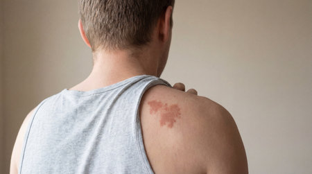 Man with shingles rash on upper back and shoulder examining irritated skin in casual tank top against neutral indoor background.