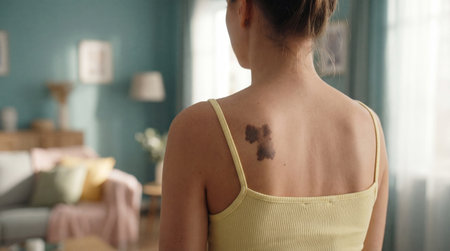 Woman examining large dark birthmark on upper back in bright living room, highlighting awareness of skin health and potential melanoma risk.