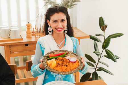 Smiling woman in traditional attire presents a plate of biryani with lemon, chili, and onion slices at a cozy dining table, inviting a homemade meal