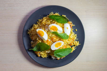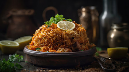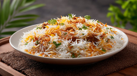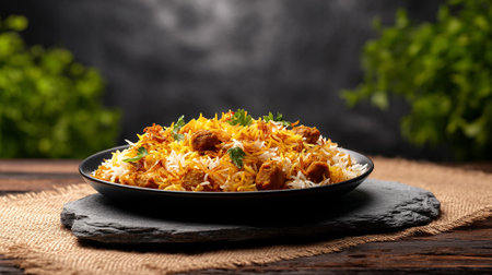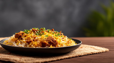 Delicious Chicken Biryani Dish Served on Rustic Wooden Table Surface